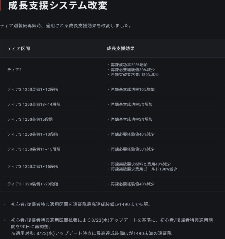 装備の区分けが変更になり、成長支援も変わった様です。