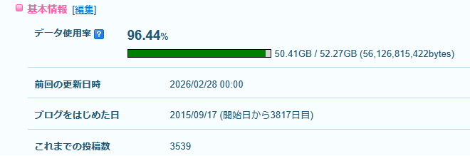 ブログの容量が再び満杯になりかけています。 Livedoor Blogは容量が増えるため、問題はないですが。